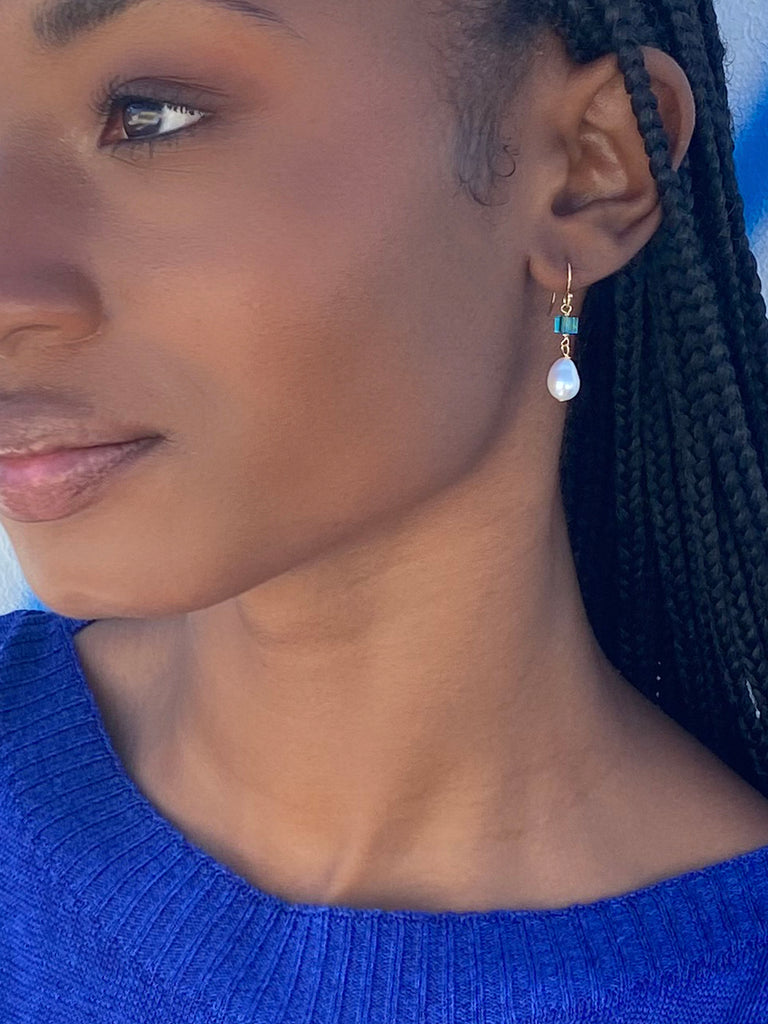 Dive into elegance with these stunning handmade earrings, where imperfectly perfect baroque pearls meet the enchanting sparkle of deep blue crystals. Inspired by the rhythm and the mystery of the ocean, this pair captures effortless luxury with a soulful twist.