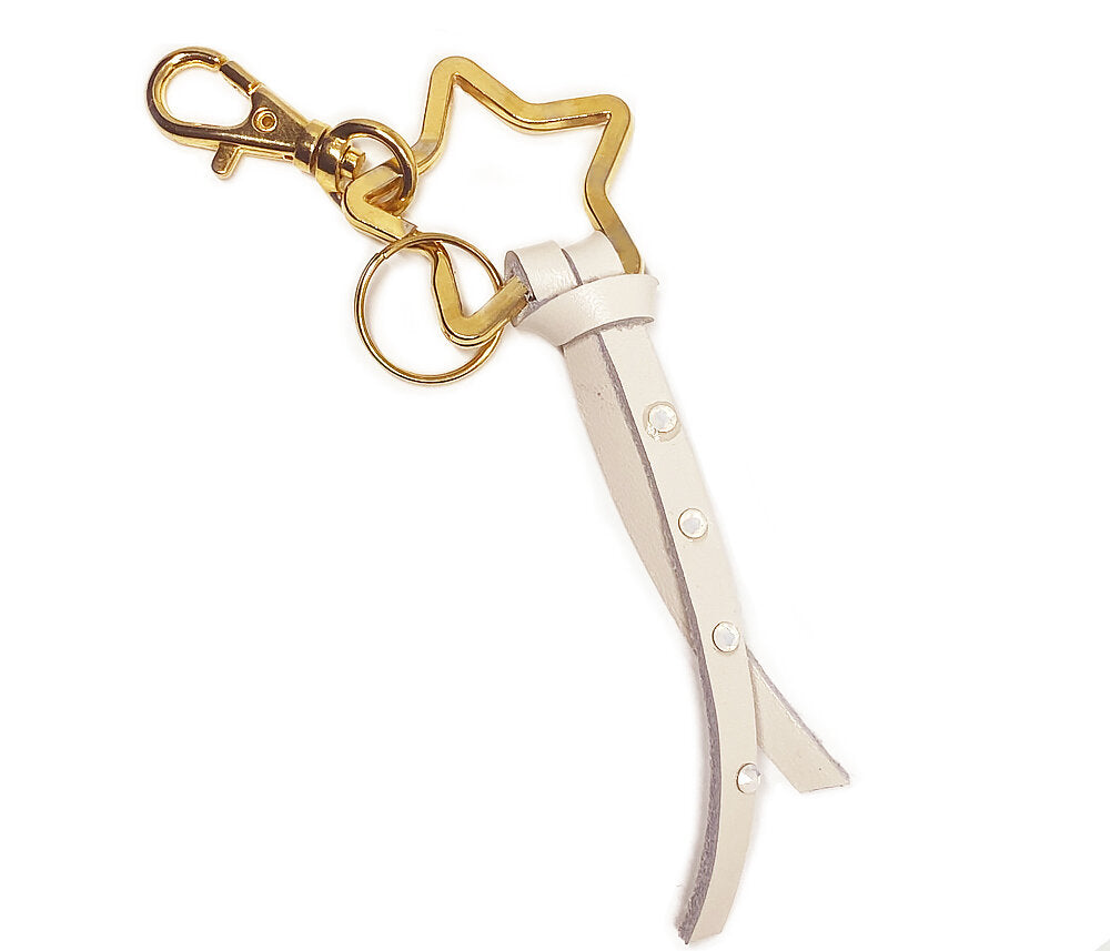 Keychain and bag charms are made of a large 35 mm gold colored metal Star , white leather studded Austrian crystals.